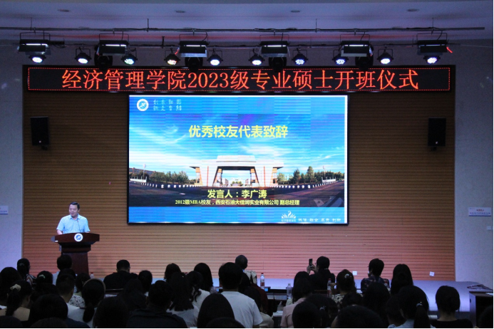 開班儀式在西安石油大學校歌《輝煌明天》的歌聲中拉開帷幕。王君萍院長首先致辭,為2023級專業(yè)學位碩士的同學們介紹了學校和學院的發(fā)展歷史,讓同學們了解學院的辦學優(yōu)勢和發(fā)展前景,并對同學們的加入表示熱烈歡迎。王剛副書記和李春霄副院長分別從學生管理和研究生管理的角度對同學們提出期許和希望,希望同學們能迅速轉(zhuǎn)變思維,盡快投入到研究生的學習中來。MBA項目負責人黃莉老師和MPAcc項目負責人寧宇新老師,分別介紹各自專業(yè)情況,也詳細說明了在整個學習過程中同學們需要注意的事項,提醒同學們不要掉以輕心,祝愿大家學有所成。導師代表楊睿娟、吳勛也為同學們提出了要求、送上了祝福。優(yōu)秀校友代表、2012級MBA學生、西安石油大佳潤實業(yè)有限公司副總經(jīng)理李廣濤也為學弟學妹們分享了自己的學習體會和感想,同學們受益匪淺。MBA專業(yè)2023級新生姚大為和MPAcc專業(yè)2023級新生馬博林同學作為新生代表發(fā)言,向?qū)W院和老師們表達了努力學習、提升能力的決心。提問交流環(huán)節(jié),同學們踴躍提問,老師們耐心解答,為接下來三年的學習生活搭建起良好的溝通渠道。