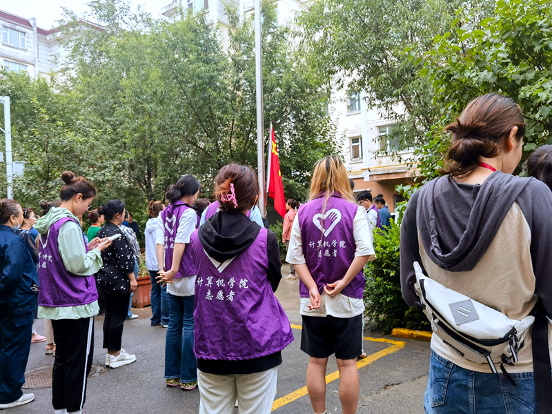 7月10日,社區(qū)組織升旗儀式,群眾自發(fā)的到達(dá)現(xiàn)場(chǎng),狹小的廣場(chǎng)中擠滿了社區(qū)的男女老少。實(shí)踐團(tuán)全體成員也參與其中,統(tǒng)一的紫色隊(duì)服和整潔的精神面貌為社區(qū)每周一的升旗活動(dòng)增添了一道不一樣的風(fēng)景。