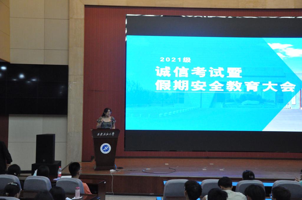 為進一步加強學院學風建設,嚴肅考風考紀,落實假期安全教育、朋輩教育、社會實踐等各項工作,石油工程學院于6月16日上午在鄠邑校區(qū)弘石報告廳召開2021級誠信教育暨假期安全教育年級大會,本次會議由2021級輔導員秦馨雨主持,2021級全體學生參會。