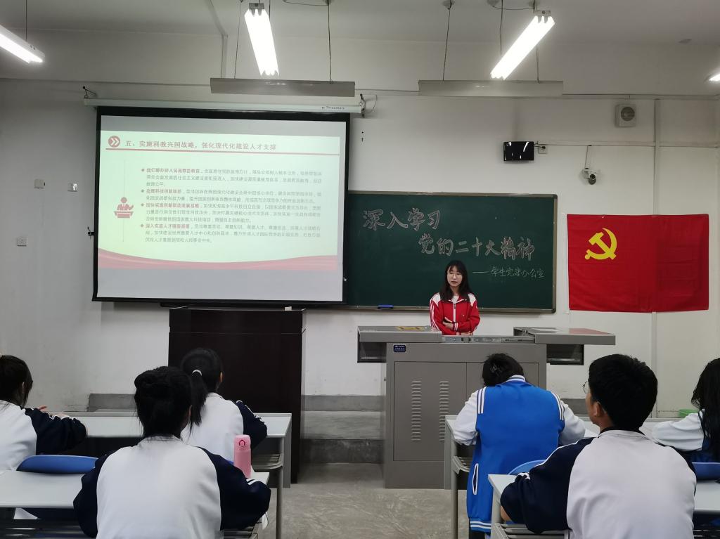 宣講活動(dòng)由學(xué)生黨建辦紀(jì)檢部負(fù)責(zé)人汪旭蕾同學(xué)擔(dān)任主講,黨建辦全體學(xué)生干部參加。汪旭蕾同學(xué)圍繞黨的歷史、形勢政策、時(shí)事熱點(diǎn)等內(nèi)容展開宣講,以互動(dòng)問答的方式帶領(lǐng)同學(xué)們深入學(xué)習(xí)黨的二十大報(bào)告中的新觀點(diǎn)、新論斷、新思想,深刻領(lǐng)會(huì)黨的二十大主題和二十大報(bào)告主要內(nèi)容,她帶領(lǐng)同學(xué)們共同學(xué)習(xí)了關(guān)于過去5年的工作和新時(shí)代10年的偉大變革,關(guān)于馬克思主義中國化時(shí)代化,關(guān)于中國式現(xiàn)代化,關(guān)于全面建設(shè)社會(huì)主義現(xiàn)代化國家的目標(biāo)任務(wù)和關(guān)于黨的全面領(lǐng)導(dǎo)和全面從嚴(yán)治黨五個(gè)部分的內(nèi)容。汪旭蕾希望在場同學(xué)后續(xù)能繼續(xù)加強(qiáng)自身學(xué)習(xí),強(qiáng)化自身專業(yè)能力,做到學(xué)以致用,讓青春之花在不懈奮斗中絢麗綻放。