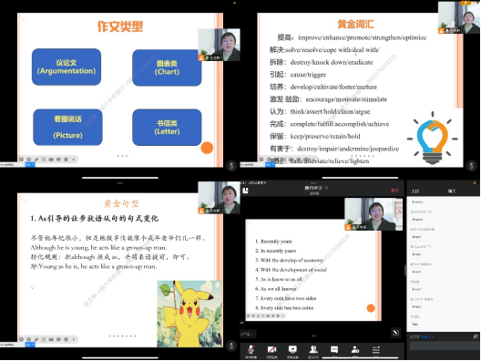 王紅老師首先為大家簡要介紹了四級寫作的評分原則,然后針對四種不同類型的作文,提出了具體的解題思路。為了幫助學生寫出結(jié)構(gòu)更明晰、詞匯使用更高級的作文,王老師分享了超級實用的干貨:寫作中的黃金句型和黃金詞匯。同時,列舉了一些同學在寫作中常犯的錯誤,大家積極在留言區(qū)互動,一起找問題,分析問題。隨后,王老師通過口語線上考試系統(tǒng)視頻,講解和分析了四級口語考試的內(nèi)容和流程,同學們在線體驗了一次口語考試。最后,梳理了全國大學生英語競賽考試題型和備考注意事項,重點介紹了高分技巧和備考錦囊,指導學生們更好地迎考備考。通過此次線上講座,同學們紛紛表示收獲滿滿,激發(fā)了備考的積極性和主動性,增強了迎戰(zhàn)四級的信心和決心。