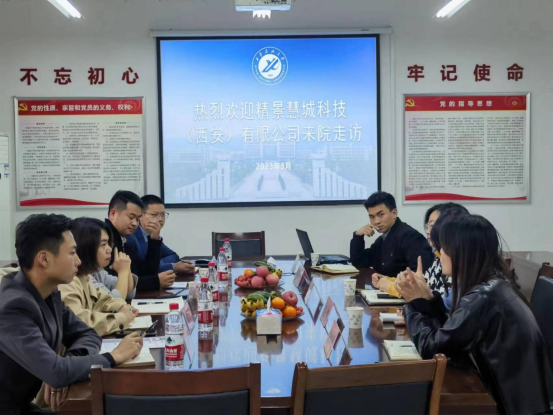 王瑩副書記首先對精景慧城(西安)科技有限公司蒞臨學院洽談合作表示熱烈歡迎,并介紹了學院的學生概況、專業(yè)分布、社會實踐等情況。隨后劉群總經(jīng)理介紹了公司的主營范圍、產(chǎn)品優(yōu)勢及發(fā)展規(guī)劃,并表示歡迎學生在校期間來公司開展社會實踐活動。雙方就共建社會實踐基地、實習實訓基地及畢業(yè)生就業(yè)實習等方面進行深度洽談。