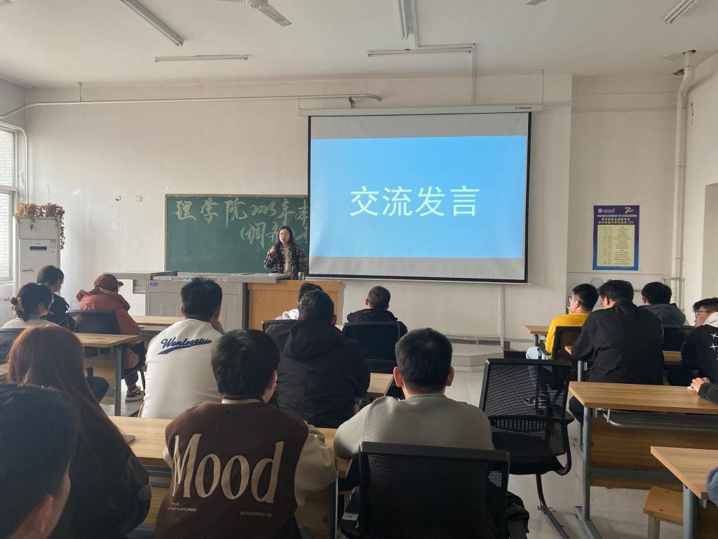 隨后,理學院2022級研究生王琛博、張玲做了分享交流。王琛博同學從自己考研復試的經(jīng)驗和教訓兩個方面做了分享,從如何跟導師發(fā)郵件、如何在線下復試中脫穎而出,如何準備英語復試、如何回答專業(yè)問題等四個方面做了經(jīng)驗分享;他也從面試說話不要卡殼、思維不要固化、心態(tài)不要緊張三個方面做了教訓分享,并希望學弟學妹們做得更好。張玲同學從各科復試細節(jié)和要點、復試真題、收集調(diào)劑信息、復試形象、復試步驟入手,分享復試心得,提出中肯建議。