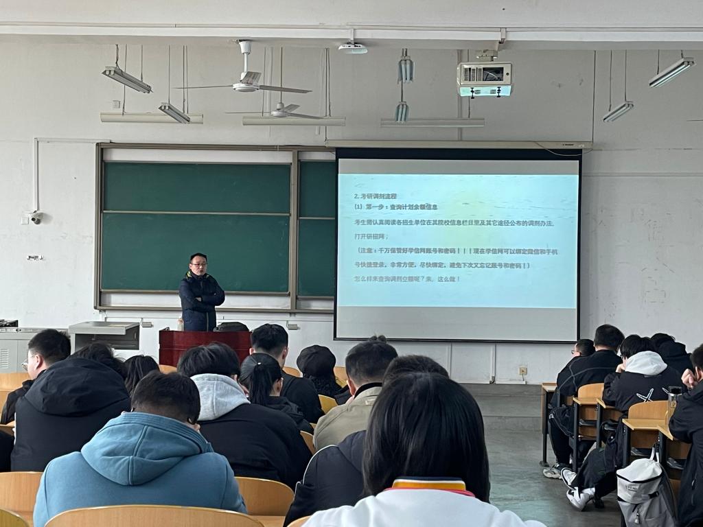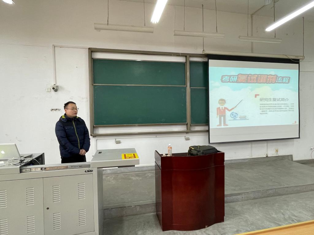 于恒老師結(jié)合考研學(xué)生的成績分布,從報(bào)考院校特點(diǎn)、考研形勢、復(fù)試流程、面試技巧和志愿調(diào)劑等五個(gè)方面向大家做了詳細(xì)的講解。他強(qiáng)調(diào),第一,要把握時(shí)間節(jié)點(diǎn),通過所報(bào)考學(xué)校的研究生招生網(wǎng)和所報(bào)考學(xué)院官網(wǎng)的研究生招生信息欄目了解復(fù)試錄取實(shí)施細(xì)則,充分做好復(fù)試準(zhǔn)備;第二,積極拓寬信息渠道,通過郵件、短信和電話等方式主動(dòng)聯(lián)系意向?qū)?,向研究生師兄師姐請教如何做好?fù)試準(zhǔn)備;第三,有調(diào)劑意愿的學(xué)生要積極關(guān)注調(diào)劑信息,做好心理調(diào)適、面試禮儀等工作,積極通過各種信息渠道及時(shí)了解校內(nèi)外的調(diào)劑公告。在現(xiàn)場答疑環(huán)節(jié)中,于恒老師對學(xué)生提出的問題逐一解答,結(jié)合學(xué)生實(shí)際情況有針對性地給予相應(yīng)的建議,使學(xué)生對復(fù)試和調(diào)劑工作有更加深入地了解。