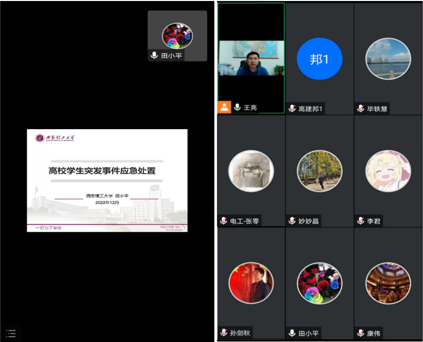 為深入貫徹全國高校思想政治教育工作會(huì)議精神,落實(shí)《西安石油大學(xué)卓越輔導(dǎo)員素質(zhì)能力提升計(jì)劃》,進(jìn)一步提升我校輔導(dǎo)員應(yīng)急處突能力,按照2022年輔導(dǎo)員專題培訓(xùn)工作安排,1216日,學(xué)生工作部組織全校學(xué)工干部在騰訊會(huì)議上開展2022年輔導(dǎo)員專題培訓(xùn)第五講高校學(xué)生突發(fā)事件應(yīng)急處置。培訓(xùn)由西安理工大學(xué)學(xué)生工作部、研究生工作部、武裝部部長田小平主講,我校學(xué)生工作部部長王亮主持。