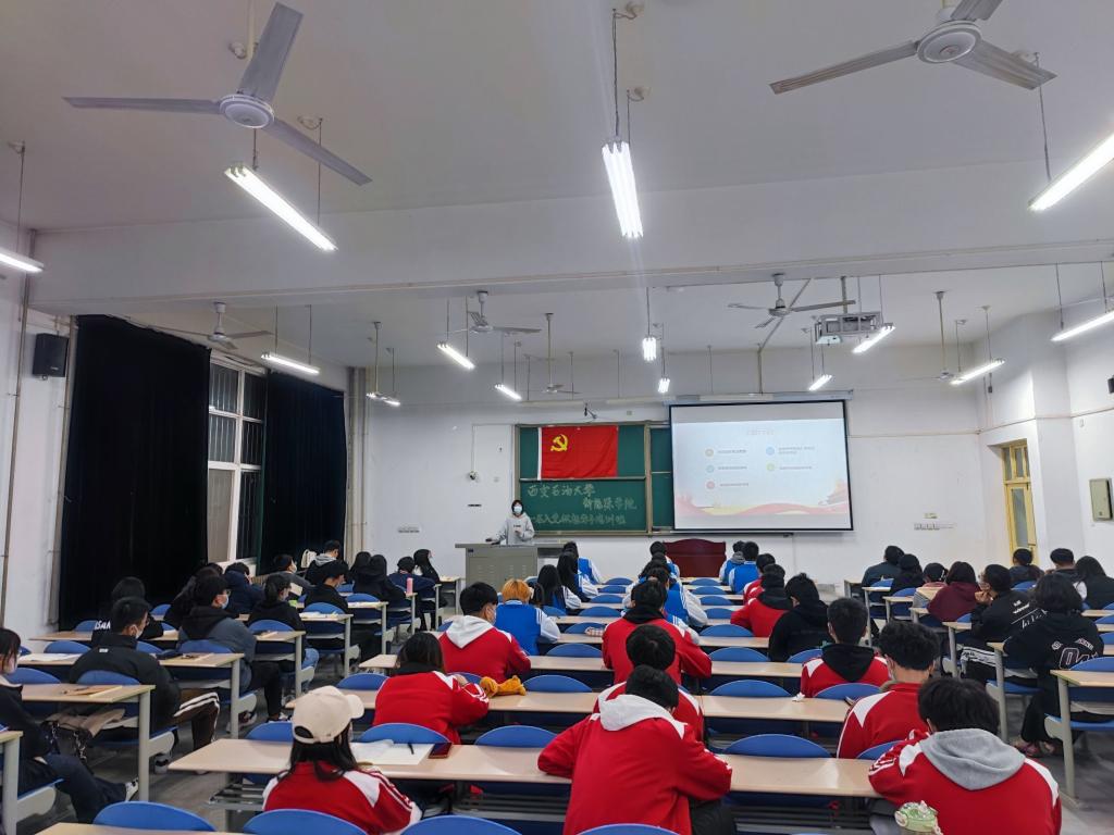 11月18日晚,培訓(xùn)班第十講“堅(jiān)定信念—爭(zhēng)做矢志報(bào)國(guó)的新時(shí)代‘綠能’先鋒”在鄠邑校區(qū)天工樓115室舉行,學(xué)院黨委書(shū)記宋海洋擔(dān)任主講。宋海洋從賡續(xù)紅色血脈、傳承奮斗精神,百年大黨的青年擔(dān)當(dāng),新時(shí)代青年的新使命,搭建青年創(chuàng)新平臺(tái)、助力青年成長(zhǎng)成才等四個(gè)方面,引導(dǎo)同學(xué)們要清醒地認(rèn)識(shí)到不論過(guò)去、現(xiàn)在還是未來(lái),中國(guó)青年始終是實(shí)現(xiàn)中華民族偉大復(fù)興的先鋒力量,作為青年人要始終與祖國(guó)共奮進(jìn),堅(jiān)定跟黨走。最后,宋海洋從學(xué)校的石油精神,黨的革命精神,青年學(xué)子的擔(dān)當(dāng)?shù)确矫鏋橥瑢W(xué)們進(jìn)行深入淺出的講解,他叮囑同學(xué)們要時(shí)刻秉承西石大的精神基因,勇做具有寬廣格局、全球視野、創(chuàng)新思維和創(chuàng)新能力的新時(shí)代負(fù)重前行的開(kāi)拓者。