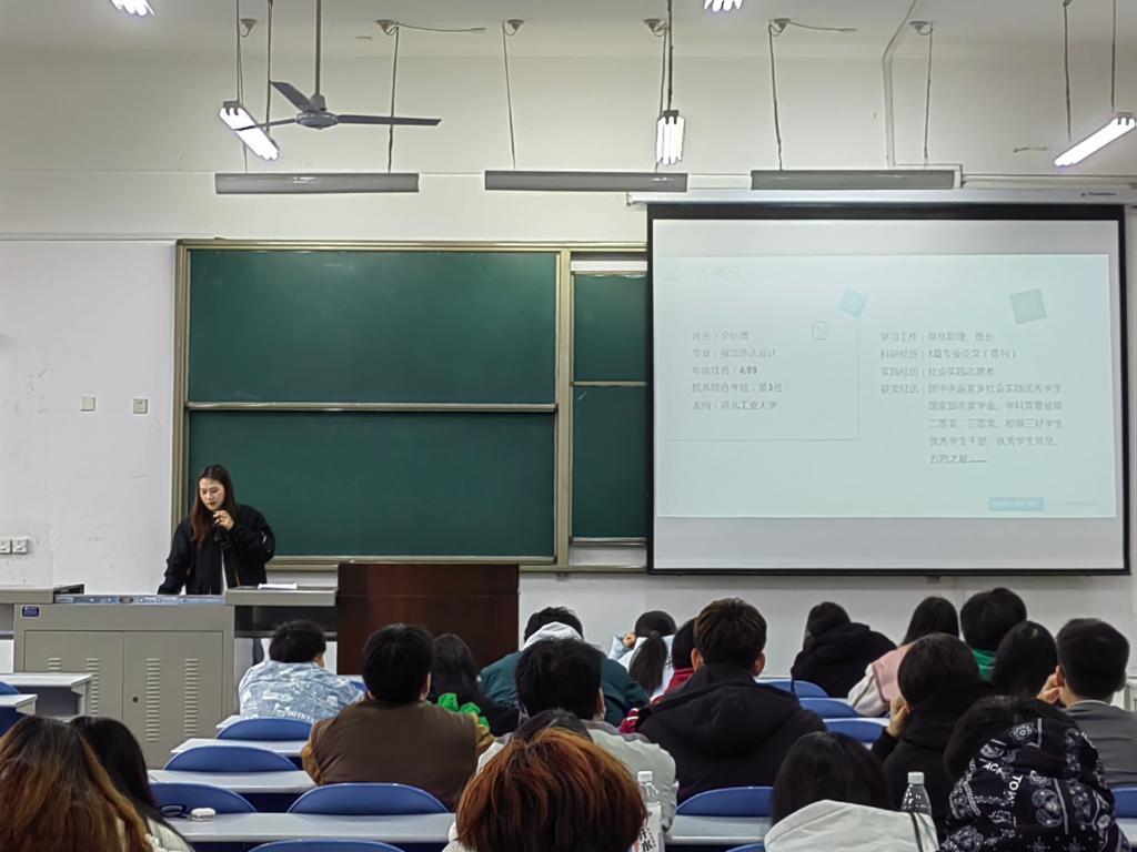 辛怡萱同學(xué)向同學(xué)們?cè)敿?xì)講解了保研推免的資格獲取要求,以及多種保研方法,很詳細(xì)地將準(zhǔn)備資料、院校面試、確定錄取各個(gè)時(shí)間段中的問(wèn)題進(jìn)行解釋,期間不斷回應(yīng)同學(xué)們的疑惑。希望同學(xué)們懂得利用學(xué)校資源,從而彌補(bǔ)自己的不足。最后她特別強(qiáng)調(diào)了設(shè)計(jì)類專業(yè)英語(yǔ)四級(jí)的重要性,并將自己學(xué)習(xí)四級(jí)的應(yīng)試技巧進(jìn)行了分享。