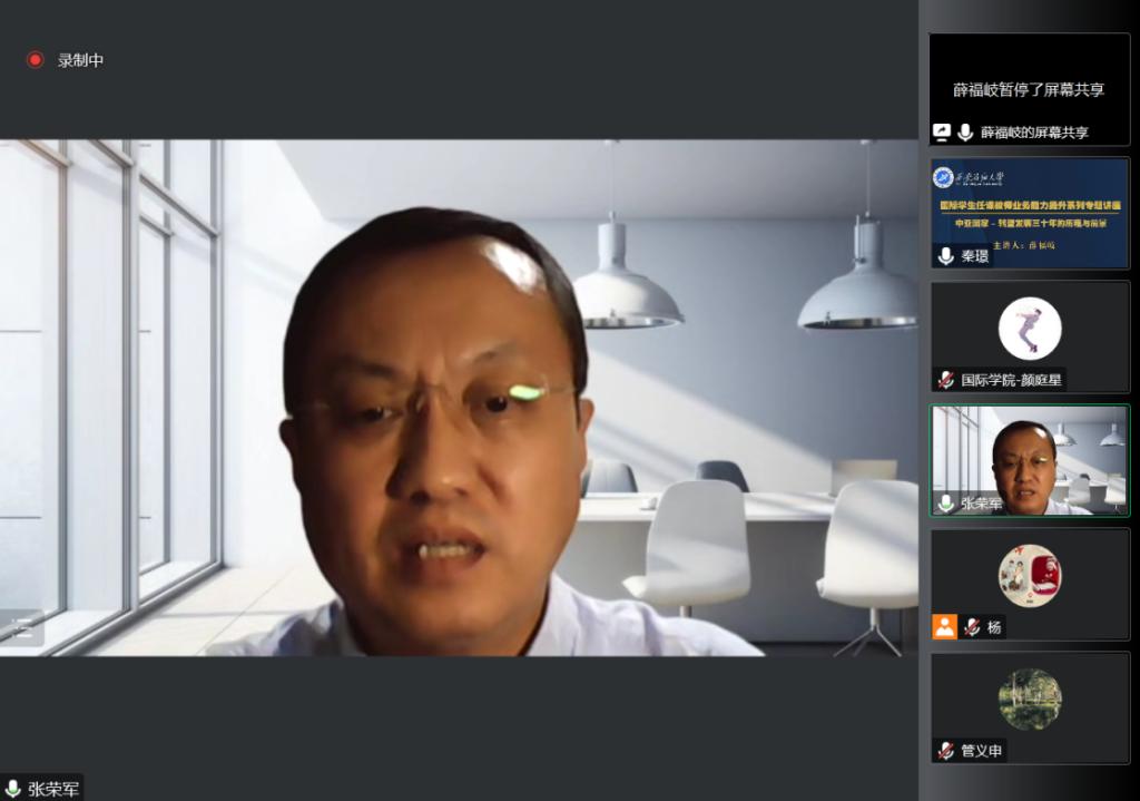 2022年10月27日晚,培訓(xùn)活動(dòng)的首場(chǎng)講座《中亞國(guó)家-轉(zhuǎn)型發(fā)展三十年的歷程與前景》于線上舉行。該講座由中國(guó)社會(huì)科學(xué)院俄羅斯東歐中亞研究所研究員、戰(zhàn)略研究室主任,中俄戰(zhàn)略協(xié)作高端合作智庫(kù)辦公室主任,國(guó)務(wù)院發(fā)展研究中心歐亞社會(huì)發(fā)展研究所研究員、中國(guó)國(guó)際電視臺(tái)俄語(yǔ)頻道特約評(píng)論員薛福岐博士主講。副校長(zhǎng)張榮軍教授主持,陜西省人民對(duì)外友好協(xié)會(huì)歐亞部部長(zhǎng)梁鋒出席,我校國(guó)際教育學(xué)院(絲路能源學(xué)院)、外國(guó)語(yǔ)學(xué)院、人文學(xué)院等院(系)及單位近150名師生參加了本次講座