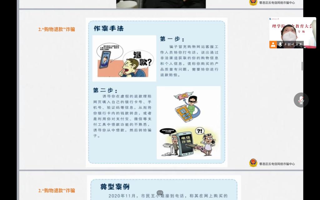 為提高學(xué)生安全意識,維護(hù)學(xué)生人身和財產(chǎn)安全,10月17日晚,理學(xué)院在線舉辦了預(yù)防電信詐騙專題安全教育大會。大會邀請鄠邑區(qū)灃京派出所鄭昊警官進(jìn)行宣傳教育,理學(xué)院學(xué)工辦主任丁亦喆主持,各年級輔導(dǎo)員全程參與。理學(xué)院600余名本、碩學(xué)生分三個會議室參會學(xué)習(xí)。