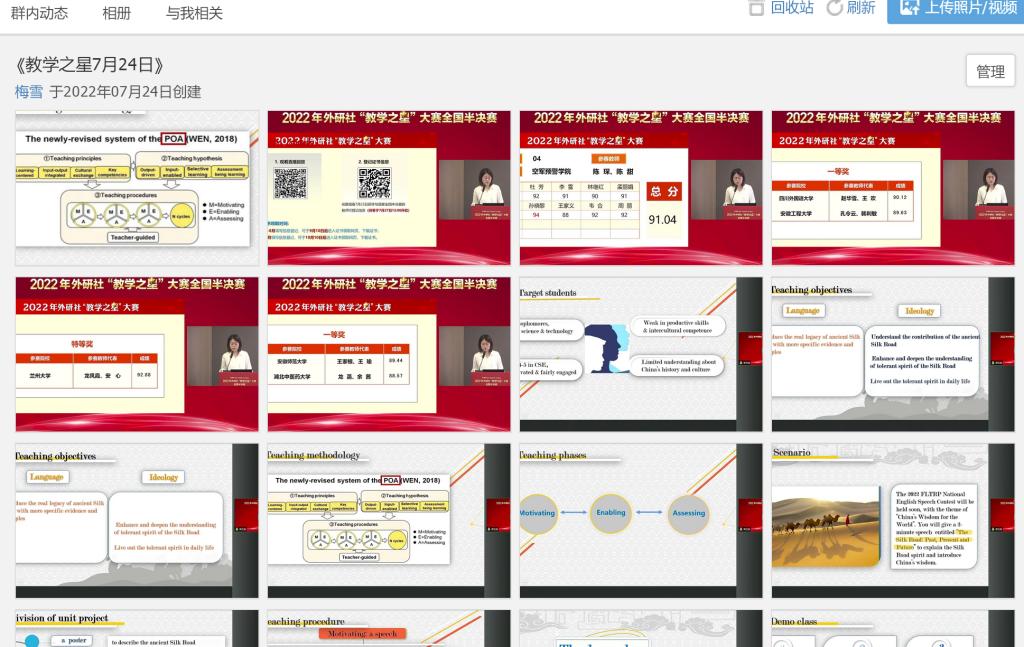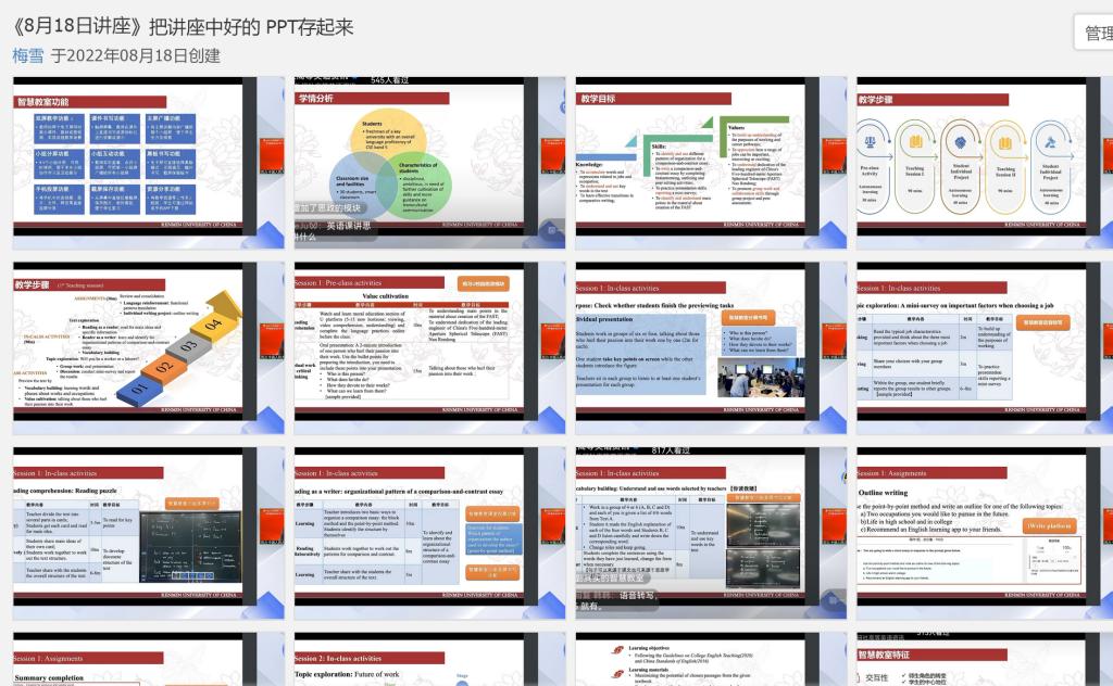 大學(xué)外語教學(xué)一部根據(jù)教學(xué)部所承擔(dān)的教學(xué)任務(wù)特點,教師個人發(fā)展需求,以及院校特色選取了研修班和論壇日程安排中部分講座作為必修內(nèi)容,如“高質(zhì)量發(fā)展背景下一流課程建設(shè)理念與實施路徑”、“智慧賦能:打造WE外語教育的共同未來”、“文明互鑒:高校外語教師中外人文素養(yǎng)提升”、“外語課程思政的縱深推進:人才培養(yǎng)的目標(biāo)、理念與路徑”、“學(xué)科智慧教室環(huán)境下的新型課堂教學(xué)模式創(chuàng)新與實踐云專題”等,要求全體教師認真學(xué)習(xí),互相交流學(xué)習(xí)心得,并在教學(xué)部工作群中建立了相應(yīng)的講座資料群相冊,留存講座重要內(nèi)容,以供后期查閱學(xué)習(xí)。同時,大外教學(xué)一部也鼓勵教師們根據(jù)自己的教研興趣選修研修班和論壇日程中其它講座內(nèi)容。