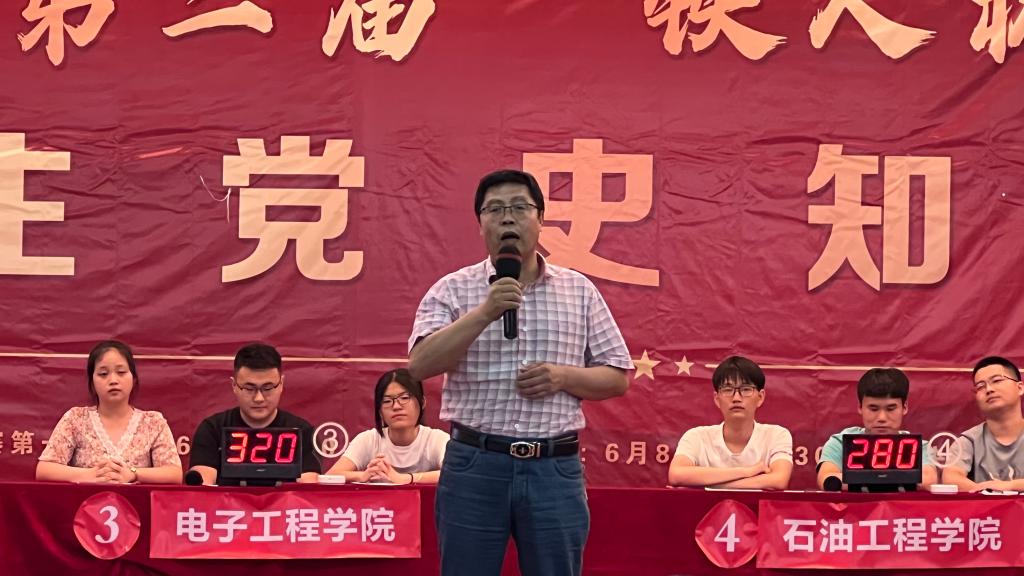 我校十三個學(xué)院分別派出代表隊參賽,通過前期抽簽決定預(yù)賽順序。預(yù)賽第一場參賽隊伍包括經(jīng)濟(jì)管理學(xué)院、理學(xué)院、電子工程學(xué)院、石油工程學(xué)院、音樂系、計算機(jī)學(xué)院六支代表隊。競賽設(shè)置每人必答、每隊必答、隊員搶答、隊伍搶答、勇攀高峰五個環(huán)節(jié),競賽題型分為必答題、搶答題、風(fēng)險題三種題型,競賽圍繞黨史、新中國史、改革開放史、社會主義發(fā)展史等內(nèi)容開展,并特別增加了大慶精神(鐵人精神)及我校校史等相關(guān)內(nèi)容。
