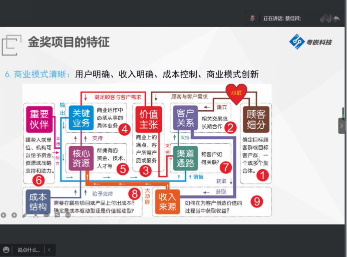 課程最后,蔡老師通過對幾個經(jīng)典案例的講解與分析強調(diào)了大賽項目中所需注意的其他事項,如“把握好市場容量”“收集并利用好相關(guān)資源”“構(gòu)建好核心成員”“擁有過硬的科研成功”等。并表示希望學(xué)員們能深刻領(lǐng)會此次課程內(nèi)容,積極參賽,爭創(chuàng)佳績。