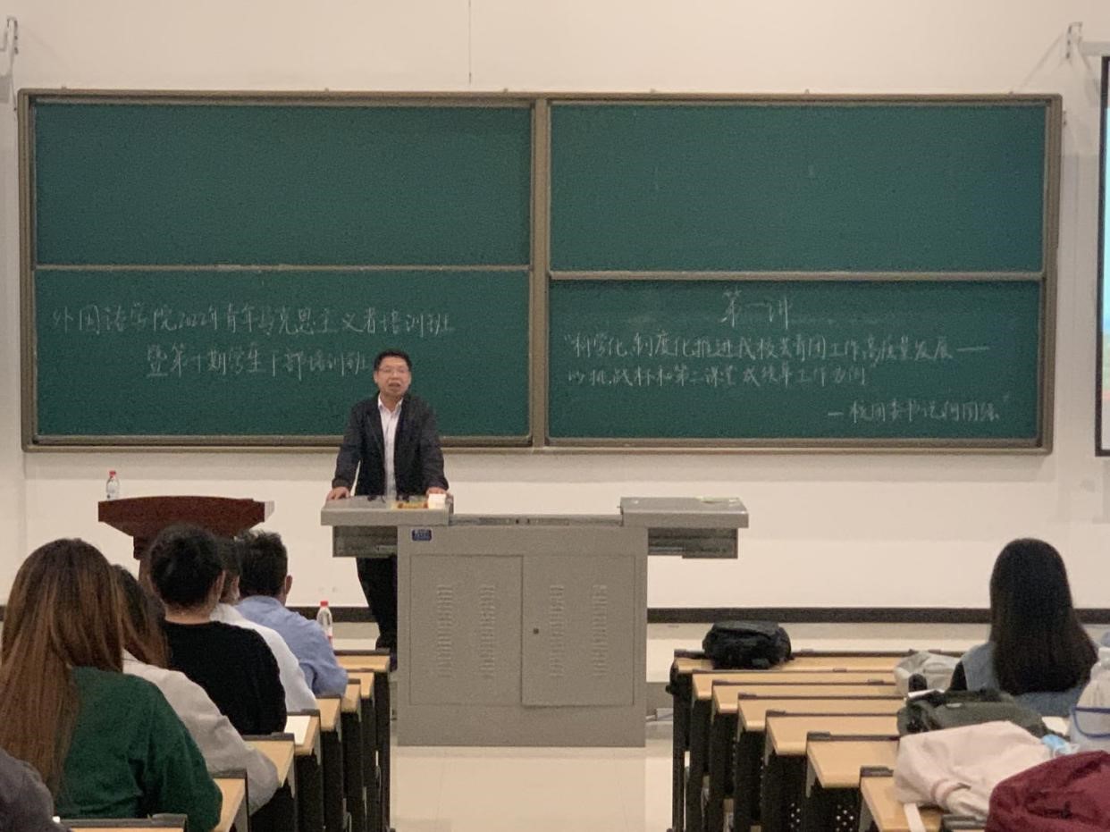 為進(jìn)一步加強(qiáng)學(xué)生干部隊(duì)伍的建設(shè),筑牢意識形態(tài)陣地,充分發(fā)揮學(xué)生干部在大學(xué)生思想政治教育中的橋梁和紐帶作用,提高學(xué)生干部的政治素質(zhì)、理論水平和業(yè)務(wù)能力,提升學(xué)院育人水平和人才培養(yǎng)質(zhì)量。5月10日,外國語學(xué)院在石工地科樓115舉辦2022年青年馬克思主義者培訓(xùn)班暨第十期學(xué)生干部培訓(xùn)班。邀請學(xué)校團(tuán)委書記何國強(qiáng)擔(dān)任主講老師,學(xué)院黨委副書記王業(yè)青做了開班儀式動員,活動由學(xué)院輔導(dǎo)員陳浩主持。