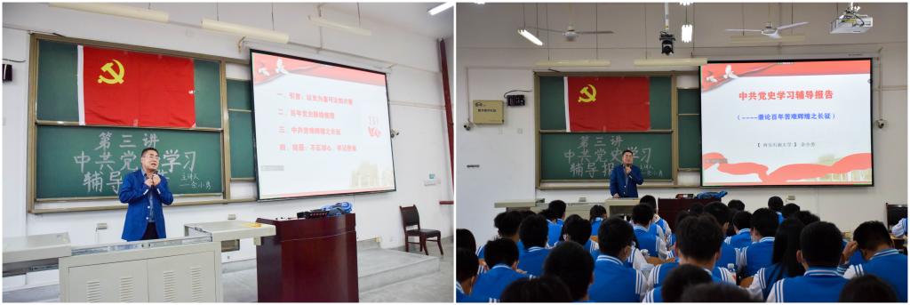 課堂上,余小勇老師圍繞著“以史為鑒,可以知興替”,“百年黨史脈絡(luò)梳理”“中共苦難輝煌之長(zhǎng)征”以及“不忘初心、牢記使命”四個(gè)部分,闡述了學(xué)習(xí)黨史的重大意義。通過對(duì)“新民主主義革命階段,社會(huì)主義革命和建設(shè)階段,改革開放和社會(huì)主義現(xiàn)代化建設(shè)階段,中國(guó)特色社會(huì)主義新時(shí)代”這四個(gè)階段的詳細(xì)講解,幫助同學(xué)們理清了中國(guó)共產(chǎn)黨的歷史發(fā)展脈絡(luò),進(jìn)一步了解黨的不懈奮斗史、黨的理論探索史和黨的自建史。