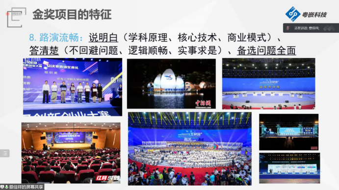 “好的項目要好好講出來”,蔡老師以往年國家級金獎項目為例,為同學(xué)們總結(jié)了金獎項目的八大特征,幫助參賽團(tuán)隊準(zhǔn)確完善自身項目,提升路演答辯技巧。