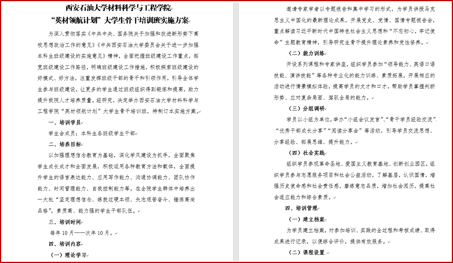 班級建設(shè)·工作創(chuàng)新 【“英材領(lǐng)航計劃”大學(xué)生骨干培訓(xùn)班】從2021級本科生開始,學(xué)院堅持以加強理想信念教育為基礎(chǔ),深化班風學(xué)風建設(shè),全面聚焦學(xué)生成長成才和全面發(fā)展,積極運用各種教育方法和載體,全面提升學(xué)生的語言表達能力、應(yīng)用寫作能力、溝通協(xié)調(diào)能力、團隊協(xié)作能力、時間管理能力、自我控制能力。旨在從低年級開始培養(yǎng)出一大批“堅定理想信念、練就過硬本領(lǐng)、矢志艱苦奮斗、錘煉高尚品格”,素質(zhì)高、能力強的學(xué)生干部隊伍。