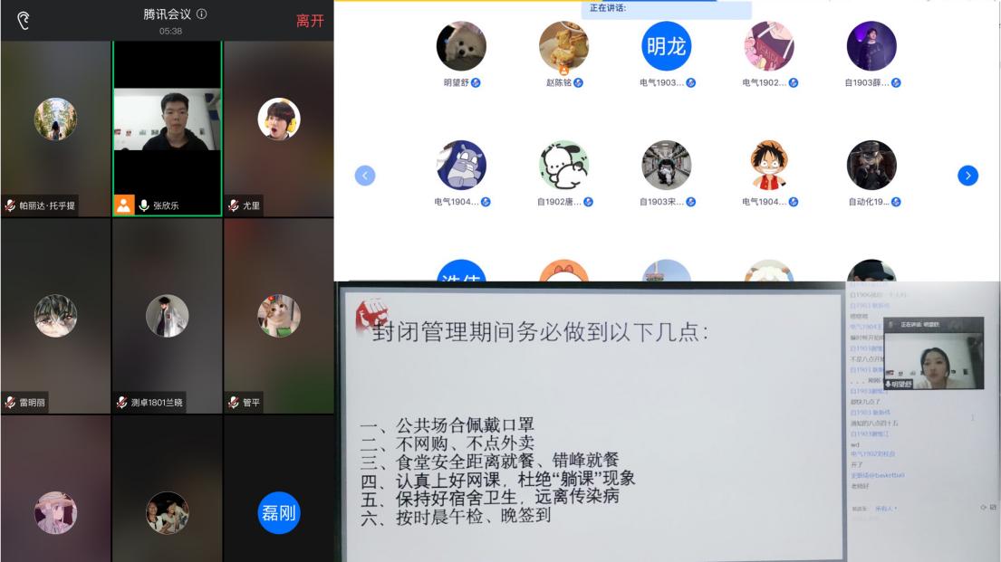 當晚,根據(jù)工作安排,電子工程學院各班召開線上疫情防控主題班團會。在各班的主題班團會上,輔導員就學校近日關(guān)于疫情防控的各項要求向?qū)W生們提出了封閉管理期間六準則:一是在校園公共場所嚴格佩戴好口罩;二是食堂就餐“錯峰就餐、間隔就座”,購餐時要保持一米間隔;三是暫停線上購物與外賣,嚴禁通過圍墻投遞物品;四是認真上好網(wǎng)課,杜絕 “躺課”現(xiàn)象;五是保持宿舍衛(wèi)生,遠離各類傳染??;六是做好晨午檢、晚簽到打卡,力爭打卡率達到100%。