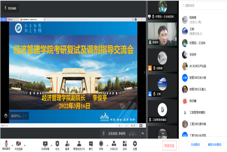 為了提升畢業(yè)生考研復(fù)試與調(diào)劑成功率,3月16日,經(jīng)濟(jì)管理學(xué)院采用騰訊會議在線上舉辦考研復(fù)試及調(diào)劑指導(dǎo)交流會。學(xué)院副院長李俊亭出席會議并作考研復(fù)試調(diào)劑指導(dǎo),2018級考研學(xué)生代表50余人參加。會議由學(xué)院黨委副書記王剛主持。