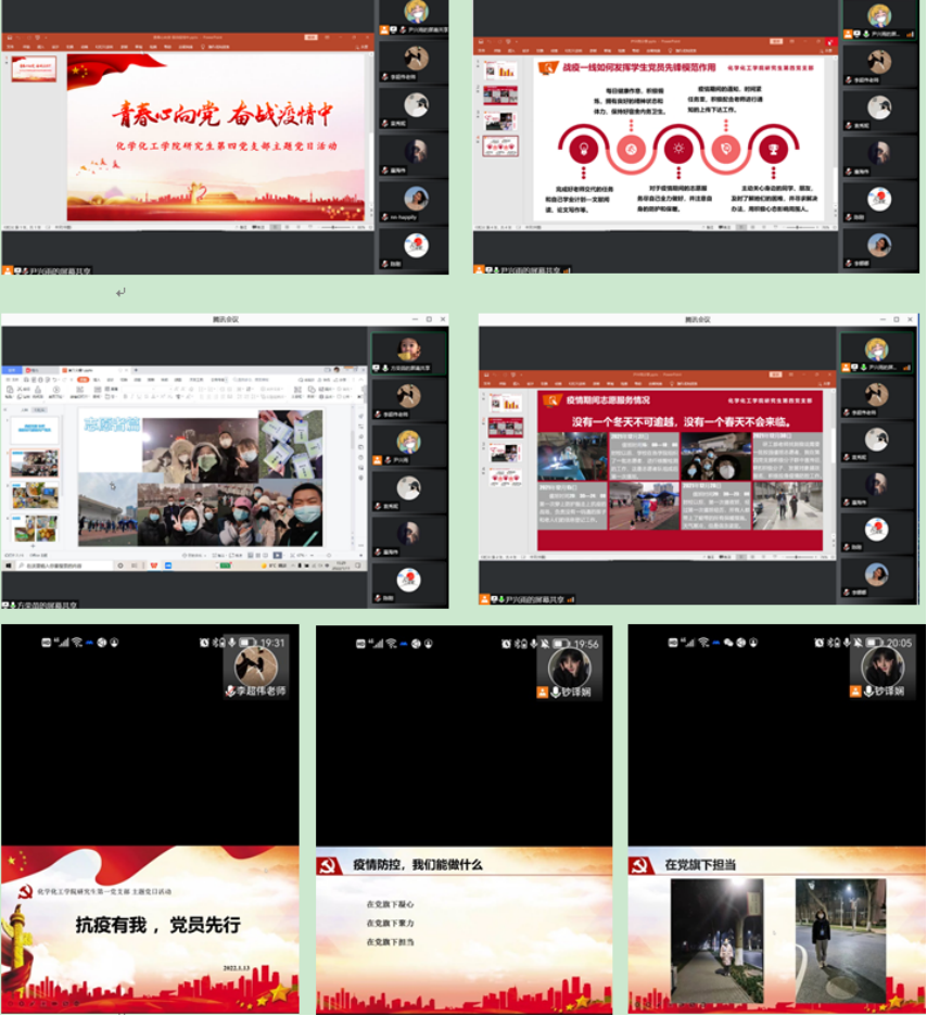 本次活動(dòng)學(xué)院每個(gè)教工黨支聯(lián)系一個(gè)學(xué)生黨支部,由教工黨支部書記通過(guò)線上參加的形式列席研究生黨支部組織生活會(huì),并指導(dǎo)支部開展“三會(huì)一課”。在研究生支部組織生活會(huì)上每名黨員同志都分享了近期封校以來(lái)自己的學(xué)習(xí)生活和工作情況,已經(jīng)志愿參加學(xué)校疫情防控志愿服務(wù)活動(dòng)的工作感受和面對(duì)本次疫情的個(gè)人心得體會(huì)。同時(shí),支部黨員分享了一些自己所學(xué)習(xí)到的先進(jìn)事跡材料和大家進(jìn)行了分享并匯報(bào)了個(gè)人的思想狀態(tài)。