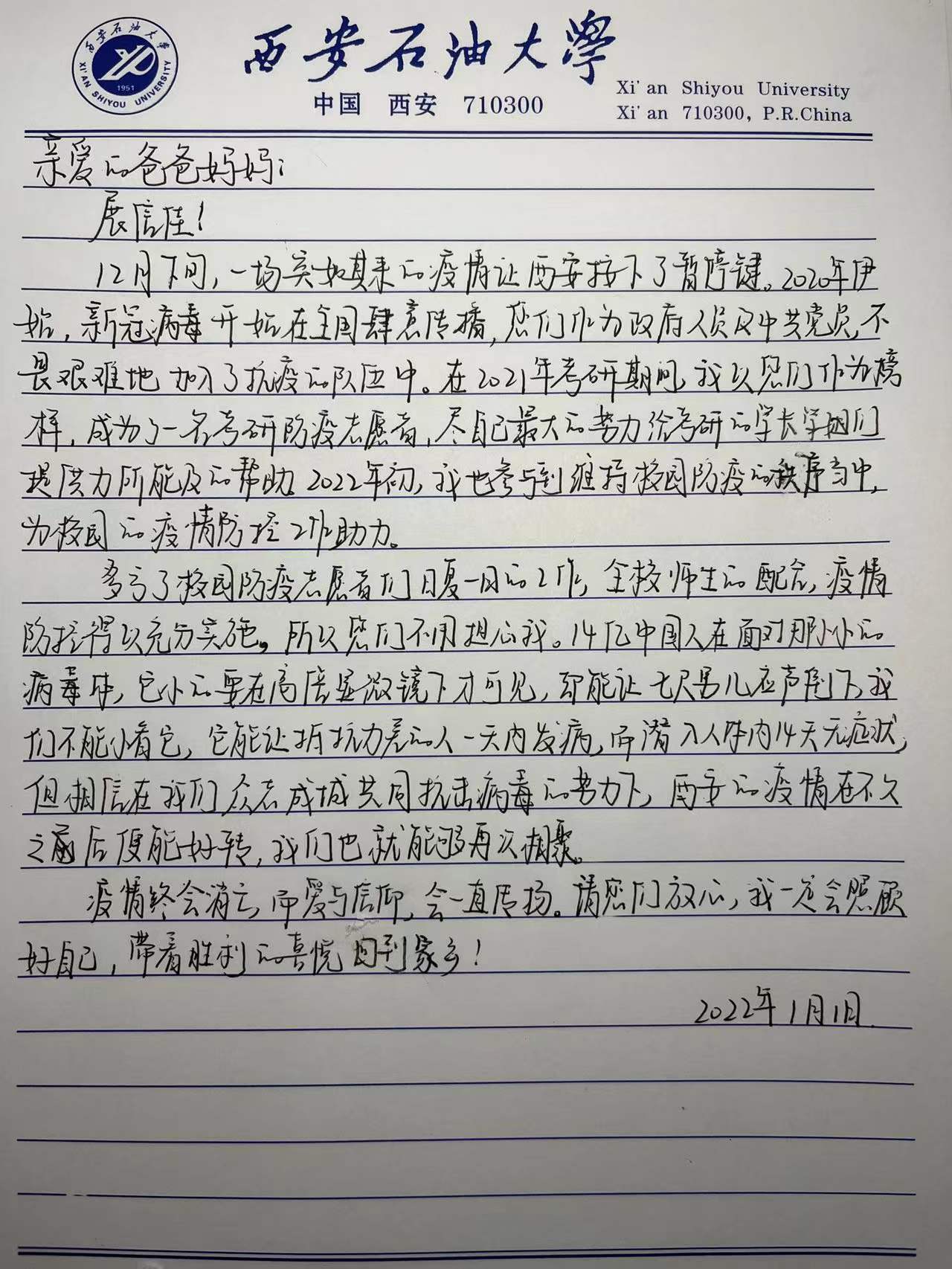 2020年疫初,謝儒瀾的父母都作為一名中共黨員盡職盡責地為疫情防控工作助力,2022年初她以父母為榜樣,每天穿上學院的藍色小馬甲加入到維持校園的防疫秩序當中:做核酸前敲門提醒大家盡快下樓,排隊做核酸時提示同學們保持間距,外出時間在同學們的出入證上加蓋印章......