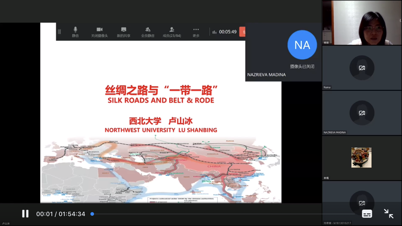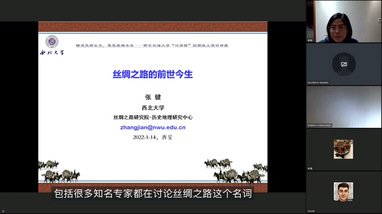 1月14日-15日,國際教育學(xué)院(絲路能源學(xué)院)特邀西北大學(xué)絲綢之路研究院院長、現(xiàn)代學(xué)院院長、博士生導(dǎo)師盧山冰教授及西北大學(xué)絲綢之路研究院張健副教授做了“一帶一路”線上專題講座,教育部“漢語橋”線上短期項目班學(xué)員及來自塔吉克斯坦、烏茲別克斯坦等國外合作“一帶一路”沿線國家合作單位的80名學(xué)員參加了講座,國際教育學(xué)院(絲路能源學(xué)院)相關(guān)負責(zé)人出席了講座。