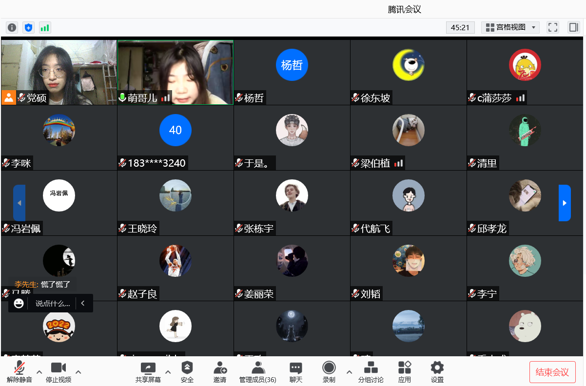 2021級(jí)研究生以“疫情防控期間感人事跡分享與當(dāng)前學(xué)習(xí)生活安排”為主題,參會(huì)同學(xué)通過(guò)分享疫情期間感人事跡、講述本人當(dāng)前學(xué)習(xí)生活安排等方式,積極開(kāi)展研討交流、互促互進(jìn)。會(huì)上,同學(xué)們逐一分享,感知抗疫英雄的力量,傾聽(tīng)榜樣學(xué)生的日常,學(xué)習(xí)抗疫英雄家國(guó)情懷,以抗疫英雄為榜樣,借鑒優(yōu)秀學(xué)生的學(xué)習(xí)科研生活規(guī)劃,努力學(xué)習(xí),勇于攀登,以實(shí)際行動(dòng)綻放青春力量,做有理想、有本領(lǐng)、有擔(dān)當(dāng)?shù)男聲r(shí)代青年。會(huì)議主持人何陽(yáng)針對(duì)班級(jí)日常管理、疫情防控、學(xué)風(fēng)班風(fēng)建設(shè)等方面存在的問(wèn)題進(jìn)行了重點(diǎn)要求和倡議。