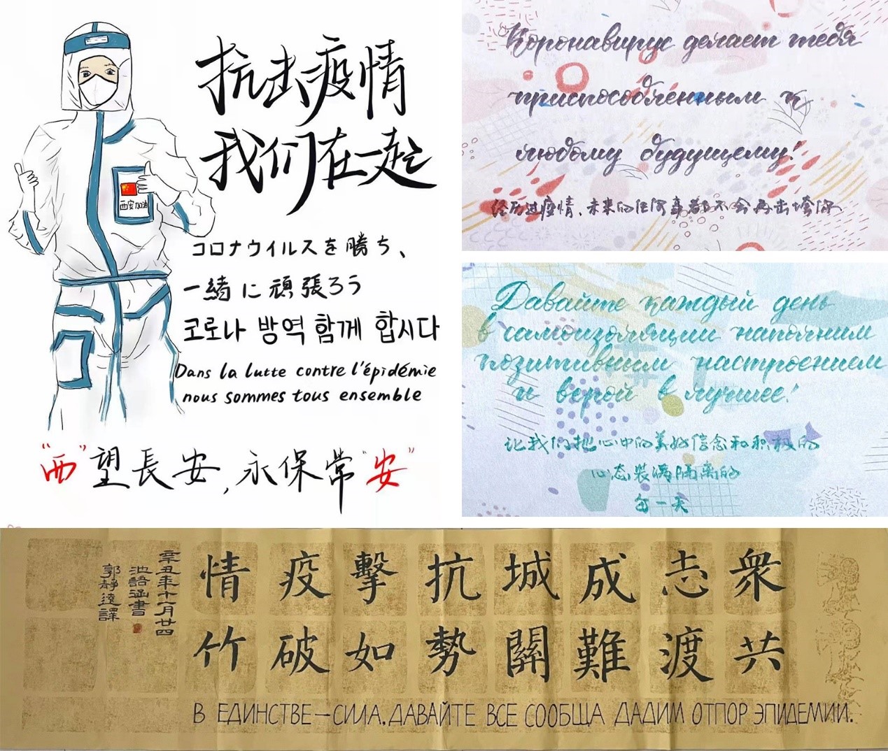 面對(duì)這場(chǎng)沒(méi)有硝煙的戰(zhàn)爭(zhēng),學(xué)院積極引導(dǎo)學(xué)生充分發(fā)揮專(zhuān)業(yè)優(yōu)勢(shì)和個(gè)人特長(zhǎng),將習(xí)近平總書(shū)記“營(yíng)造萬(wàn)眾一心阻擊疫情的輿論氛圍,凝聚起眾志成城、共克時(shí)艱的強(qiáng)大正能量”的重要指示落到實(shí)處。用俄語(yǔ)、法語(yǔ)、西班牙語(yǔ)、韓語(yǔ)、日語(yǔ)……等多語(yǔ)種錄制抗疫宣傳視頻,為戰(zhàn)疫加油,為西安加油。并鼓勵(lì)大家發(fā)揮個(gè)人特長(zhǎng),用筆墨鼓舞抗疫斗志、禮贊抗疫英雄,傳遞“西石大溫度”。