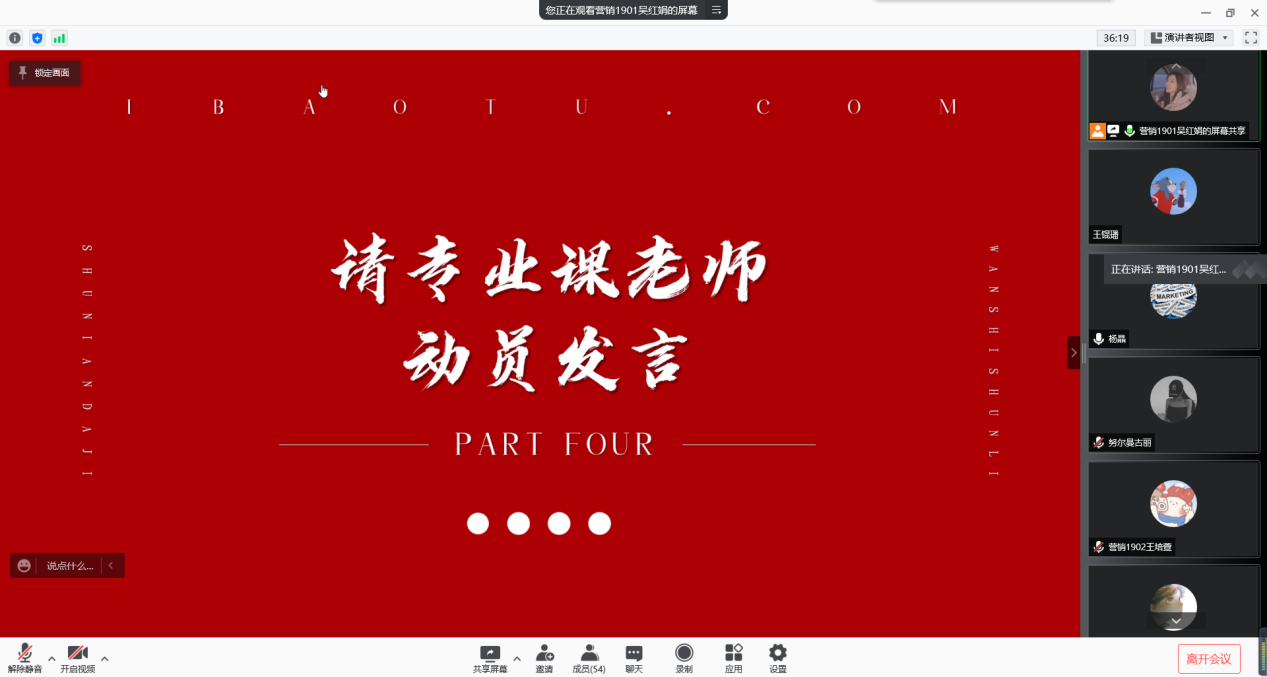 為弘揚(yáng)抗疫精神,體現(xiàn)青年擔(dān)當(dāng),經(jīng)濟(jì)管理學(xué)院2019級(jí)市場(chǎng)營(yíng)銷(xiāo)專(zhuān)業(yè)于1月10日開(kāi)展“山河無(wú)恙、人間有情”線(xiàn)上專(zhuān)業(yè)教育會(huì)。經(jīng)濟(jì)管理學(xué)院院長(zhǎng)王君萍、黨委副書(shū)記王剛,企業(yè)管理系主任楊晶、班主任袁靜、輔導(dǎo)員王璟以及2019級(jí)市場(chǎng)營(yíng)銷(xiāo)專(zhuān)業(yè)全體同學(xué)參與會(huì)議。會(huì)議由營(yíng)銷(xiāo)1901班班長(zhǎng)吳紅娟主持。
