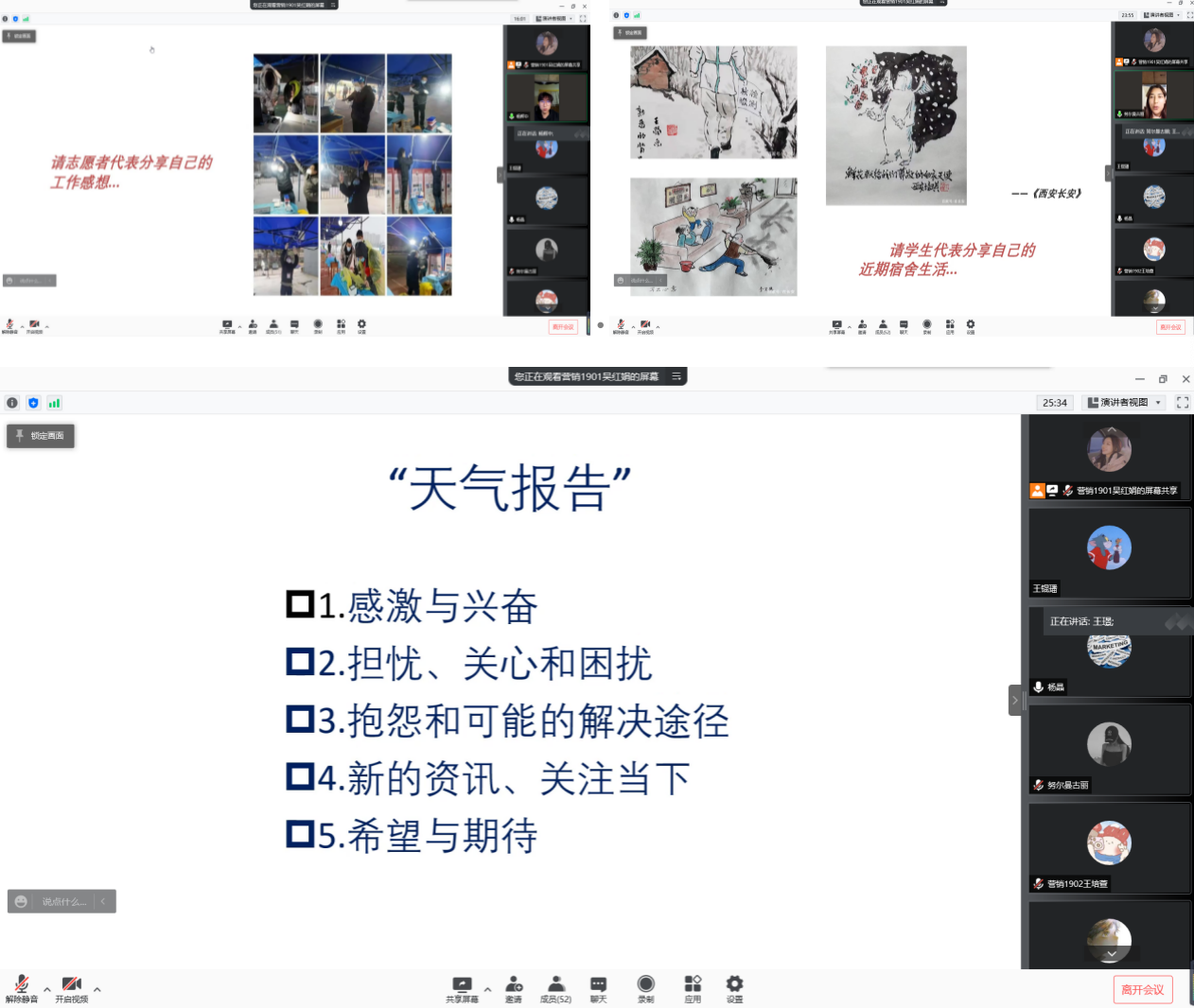 市場(chǎng)營(yíng)銷(xiāo)專(zhuān)業(yè)學(xué)生志愿者代表?xiàng)钶x中、瞿力淵同學(xué)與大家分享了志愿服務(wù)過(guò)程中的心得與收獲,他們積極動(dòng)員學(xué)生干部投身疫情防控志愿服務(wù)工作,在宿舍樓值班值守、核酸檢測(cè)組織、防疫物資搬運(yùn)中都有他們的身影。學(xué)生代表王彪、努爾曼·古麗分別分享了疫情防控期間的日常宿舍生活。