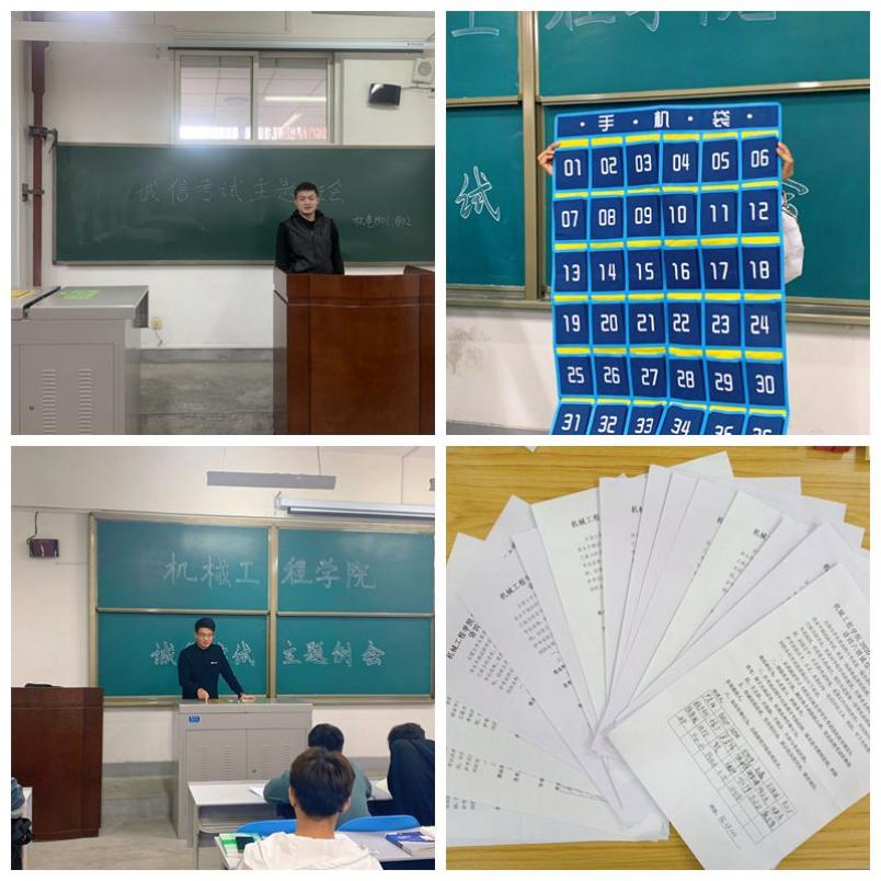為切實(shí)做好疫情防控期間英語四六級(jí)考試、期末考試誠(chéng)信教育工作,樹立良好的學(xué)風(fēng)、考風(fēng),確保學(xué)生安全、順利參加考試,機(jī)械工程學(xué)院于129日-14日不間斷開展考試誠(chéng)信教育系列活動(dòng)。為配合防疫措施,各年級(jí)采取不開大會(huì)、線上和線下結(jié)合的方式進(jìn)行誠(chéng)信教育,并以班為單位簽署《考試誠(chéng)信承諾書》。