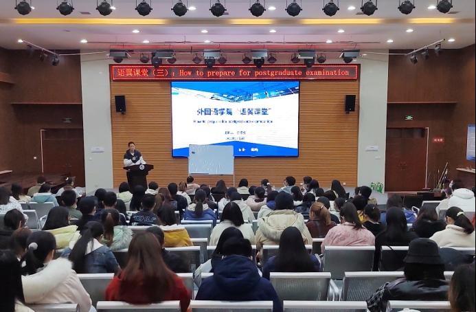 任春生老師以“How to prepare for postgraduate examination”為題,結合自己執(zhí)教過程中經(jīng)歷和經(jīng)驗,講述了考研動機的重要性、考研過程中的誤區(qū)、考研深造的可選方向、跨專業(yè)考研的可選專業(yè),著重闡述了與學院專業(yè)相關的語言學、翻譯、國別研究、文學、英語測試學等同源學科方面的具體內(nèi)容。隨后,任老師對第二外語學習和使用情況進行分析,講解了不同語言和專業(yè)結合的發(fā)展前景,希望同學們根據(jù)自身發(fā)展規(guī)劃選擇適合自己的第二外語。在交流環(huán)節(jié),任老師與在場同學進行了充分的互動交流,對同學們提出的問題進行了一一解答,幫助同學們對考研有了更深一步的認識與了解。