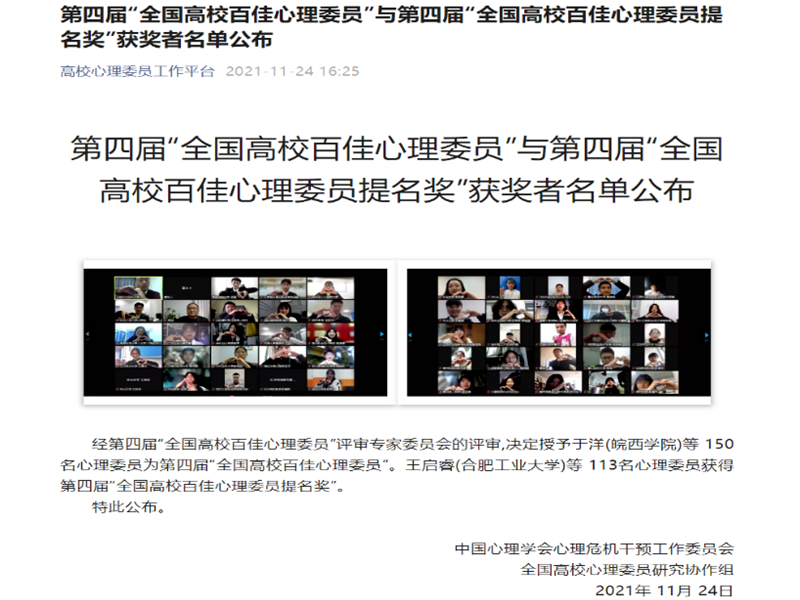 會上,全國高校心理委員研究協(xié)作組公布了第四屆“全國高校百佳心理委員”獲選名單,我校推薦的高宇航同學榮獲“全國百佳心理委員”稱號。全國百佳心理委員的評選通過學校推薦、個人事跡網絡展示及投票、專家評分等環(huán)節(jié)產生。高宇航同學的獲獎,不僅是對他個人的肯定,也是對我校心理委員隊伍建設工作的認可。