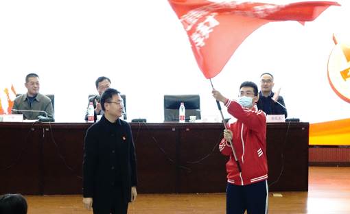 校團委書記何國強向?qū)W員代表授班旗,這標志著班級有著共同的價值認同,將旗幟舉過頭頂,將責任擔在肩上。