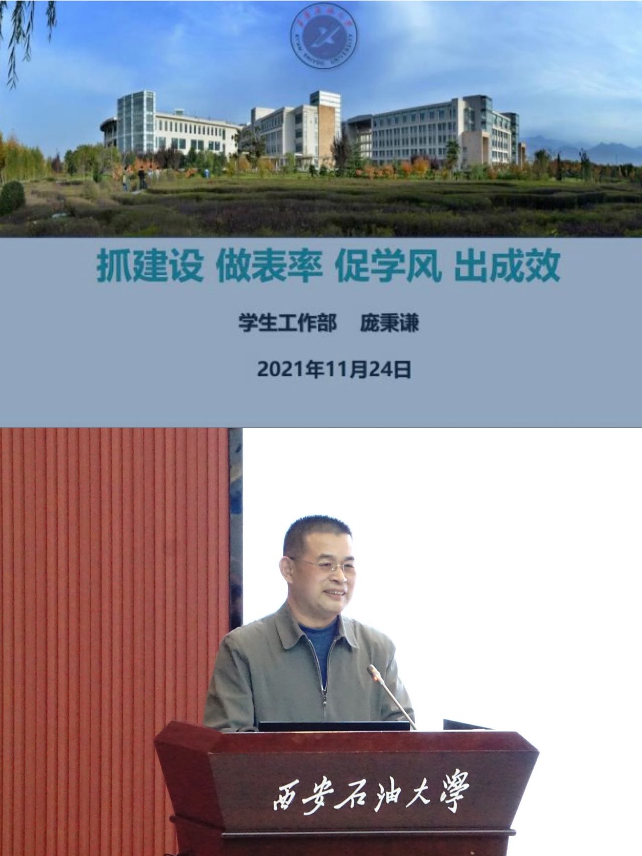隨后,校學工部副部長龐秉謙為全體學員做了題為《抓建設(shè) 做表率 促學風 出成效》的開班第一講。龐秉謙副部長分別從加強班級建設(shè)的重要性和必要性;如何做好班級建設(shè)工作;如何做一名優(yōu)秀的班級學生干部三個方面向全體學員做了高站位、高質(zhì)量的專題理論教學。尤其是在如何做一名優(yōu)秀的班級學生干部方面,龐秉謙副部長更是結(jié)合自己的學生工作經(jīng)驗和學生干部經(jīng)歷,深入淺出地引導(dǎo)學員們要把準學生干部的身份定位、正確處理學生干部的五個關(guān)系等方面做好具體工作,促進班級建設(shè)。最后他說道:“大家一定要傳承地科院的優(yōu)良學風,認真學習,不斷完善自己,爭做一名優(yōu)秀的學生、一名優(yōu)秀的學生干部,做好班級建設(shè)相關(guān)工作?!?/p>