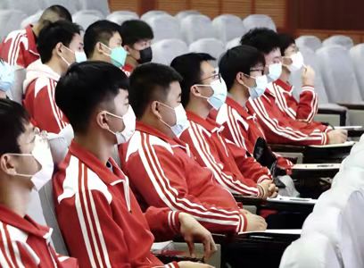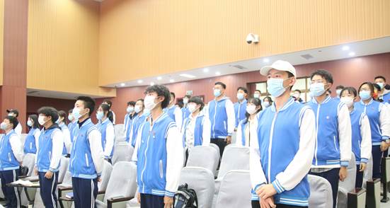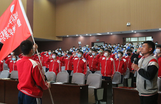 學生會主席靳興同學帶領(lǐng)全體學員面向班旗鄭重宣誓,要堅定正確的政治方向,全心全意為同學服務(wù)。