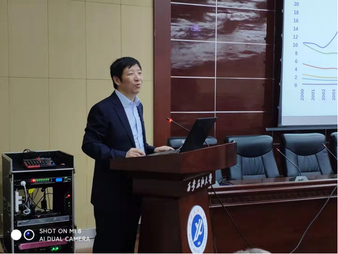 10月11日,由教師工作部、經(jīng)濟(jì)管理學(xué)院、科技處、??茀f(xié)、知聯(lián)會(huì)聯(lián)合主辦的“經(jīng)濟(jì)管理學(xué)院慶祝建校70周年系列學(xué)術(shù)報(bào)告”之《疫情沖擊、結(jié)構(gòu)分化與均衡發(fā)展》在雁塔校區(qū)第五會(huì)議室舉行。此次報(bào)告由中國(guó)社會(huì)科學(xué)院數(shù)量經(jīng)濟(jì)與技術(shù)經(jīng)濟(jì)研究所所長(zhǎng)、中國(guó)社會(huì)科學(xué)院宏觀經(jīng)濟(jì)研究智庫(kù)主任、中國(guó)社會(huì)科學(xué)院大學(xué)教授、博士生導(dǎo)師、兼中國(guó)數(shù)量經(jīng)濟(jì)學(xué)會(huì)會(huì)長(zhǎng)、工信部工業(yè)經(jīng)濟(jì)分析專家咨詢委員會(huì)成員李雪松主講,師生代表160余人參加報(bào)告會(huì),會(huì)議由經(jīng)濟(jì)管理學(xué)院院長(zhǎng)王君萍主持。