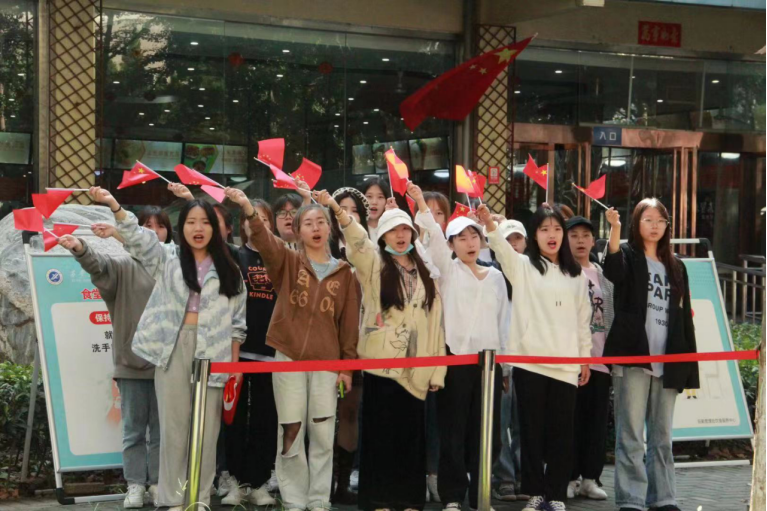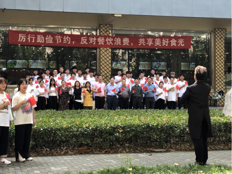中午12點10分,“紅歌快閃”活動正式開始,首先以小合唱和歌伴舞演繹了《我和我的祖國》。在優(yōu)美的旋律中,手持紅旗的師生們集體合唱了《紅星閃閃》、《輝煌明天》兩首歌曲,用歌聲抒發(fā)心中愛國熱忱?;顒釉趲熒鷤儭拔以谖靼彩痛髮W祝祖國生日快樂!”的歡呼聲中圓滿結束。