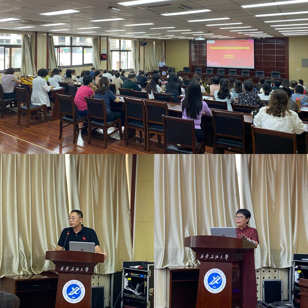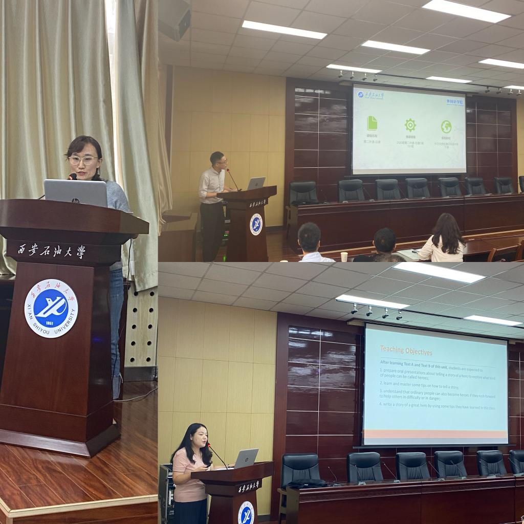 教學(xué)觀摩前,教務(wù)處副處長吳勛和外國語學(xué)院院長于艷英分別從國際形勢,外語教學(xué)等方面強(qiáng)調(diào)了課程思政的重要性做了講話。教學(xué)示范觀摩活動(dòng)特邀請我院在西安石油大學(xué)課程思政大練兵競賽獲得二等獎(jiǎng)的周曉寒老師和在西安石油大學(xué)青年教師教學(xué)競賽一等獎(jiǎng)的陳旭老師以及在“外教社杯”全國高校外語教學(xué)大賽陜西賽區(qū)三等獎(jiǎng)苗旸老師為大家做課程思政展示,老師們在教學(xué)活動(dòng)中將中外文化相結(jié)合,把課程思政融入到外語教學(xué)中,引導(dǎo)學(xué)生用外語講述中國故事,用外語傳播中國文化。