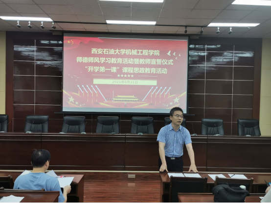 為熱烈慶祝中國(guó)共產(chǎn)黨成立100周年,全面落實(shí)習(xí)近平總書(shū)記在黨史學(xué)習(xí)教育動(dòng)員大會(huì)上的重要講話精神,按照西安石油大學(xué)《關(guān)于2021學(xué)年秋季學(xué)期開(kāi)展“開(kāi)學(xué)第一課”課程思政教育活動(dòng)的通知》的相關(guān)要求,8月31日下午,機(jī)械工程學(xué)院在雁塔校區(qū)第五會(huì)議室開(kāi)展“開(kāi)學(xué)第一課”課程思政觀摩學(xué)習(xí)活動(dòng)。機(jī)械工程學(xué)院黨委書(shū)記蔡建文、院長(zhǎng)竇益華及學(xué)院全體教職工參加了學(xué)習(xí)活動(dòng)。