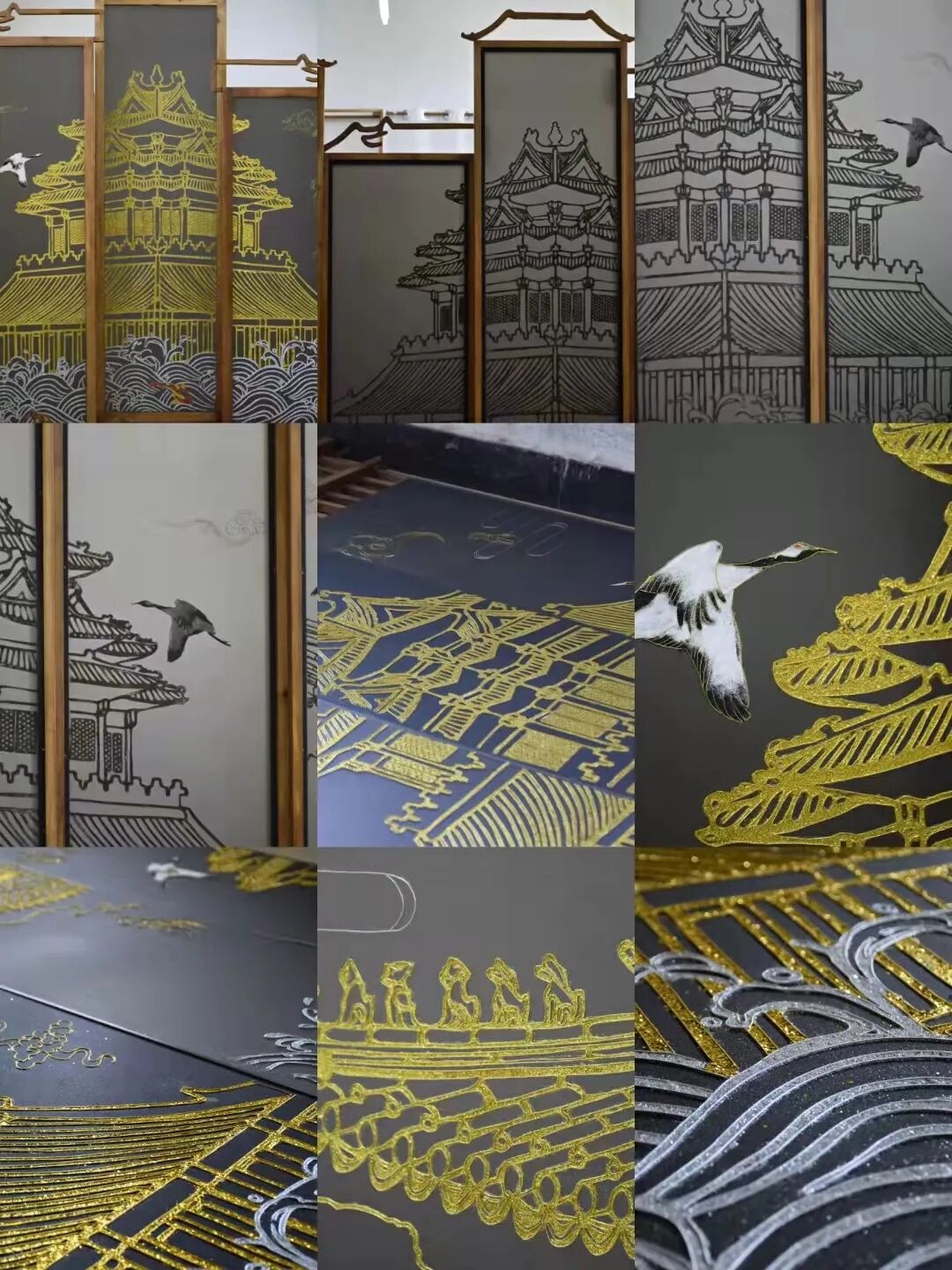 其二,這組屏風(fēng)的造型來源于故宮建筑群的屋檐,屏風(fēng)底座由故宮城樓簡化而來,屏風(fēng)內(nèi)部掐絲圖案選取了故宮角樓,配有祥云紋、仙鶴、屋脊獸作為點(diǎn)綴,營造出濃濃故宮韻味。座椅上同樣運(yùn)用掐絲與故宮元素的結(jié)合,加入囊螢照度的文化內(nèi)涵,用螢火蟲照明,引讀書人奮發(fā)向前,孜孜不倦。