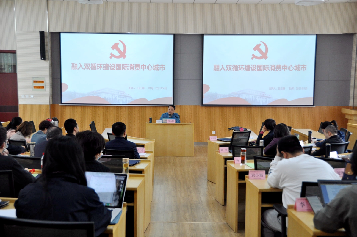 開(kāi)班儀式結(jié)束后,我基地特聘教授、陜西省委黨校(省行政學(xué)院)白山穩(wěn)教授為學(xué)員做了題為《融入雙循環(huán),建設(shè)國(guó)際消費(fèi)中心城市》的專(zhuān)題輔導(dǎo)報(bào)告。