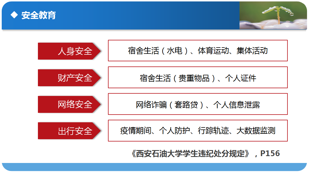 接著,李老師結(jié)合本學(xué)期返校后疫情防控期間的管理要求,從人身安全、財(cái)產(chǎn)安全、網(wǎng)絡(luò)安全、出行安全四個(gè)方面,以關(guān)鍵字和具體事例的相互串講,給大家上了一節(jié)實(shí)例滿滿的安全教育課,在重點(diǎn)時(shí)間節(jié)點(diǎn),再次提醒全體學(xué)生安全無小事、安全系大家,只有牢固樹立安全意識(shí),才能為祥和的校園生活提供保障。