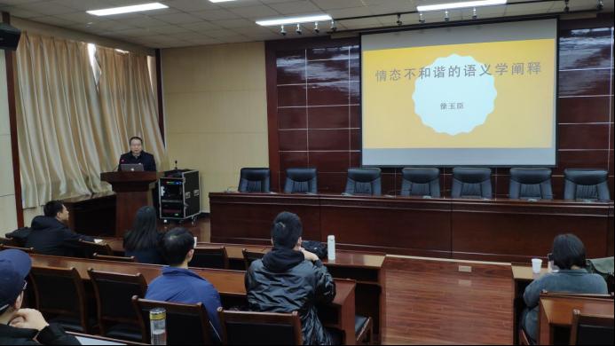 12月10日下午15:00,應(yīng)外國語學(xué)院邀請,西安外國語大學(xué)外國語言文學(xué)研究中心徐玉臣教授在雁塔校區(qū)第五會議室?guī)砹祟}為“情態(tài)不和諧的語義學(xué)闡釋”的學(xué)術(shù)報告。院長于艷英、副院長劉輝、副院長陳武及全體教師和MTI研究生參加了本次學(xué)術(shù)報告會。報告會由劉輝副院長主持。