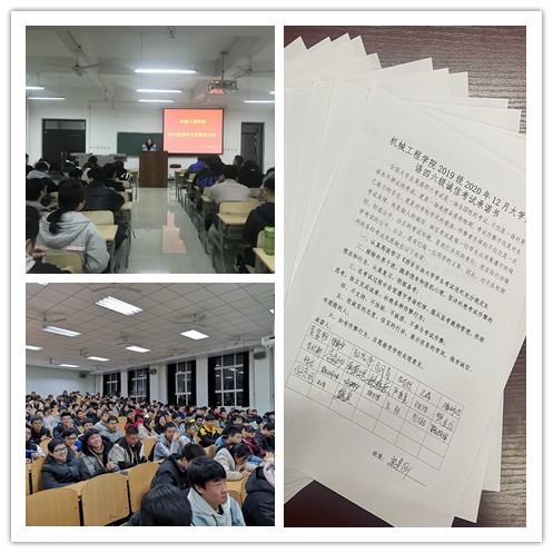 12月7日-9日,機(jī)械工程學(xué)院分年級(jí)、分批次召開英語四六級(jí)考試誠(chéng)信教育大會(huì),各年級(jí)輔導(dǎo)員老師主持會(huì)議,大會(huì)分別做考前動(dòng)員和誠(chéng)信教育。