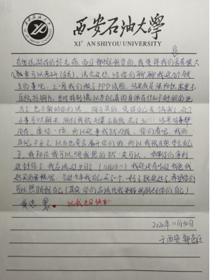 我院2020級輔導員李昱昊在總結活動時強調:社會在不斷發(fā)展,時代在不斷進步。越來越多的人通過語音視頻等方式向親人表達問候,但其實這種方式會有許多感恩的話語難以用語言表達,本次活動旨在于引導大家通過傳統(tǒng)的書信加深與父母及親友的情感溝通,懂得體會父母的不易,懂得父母的辛苦付出和默默承擔,培養(yǎng)大家的感恩意識、責任意識、獨立人格。