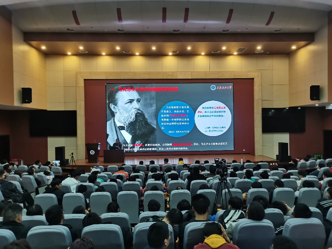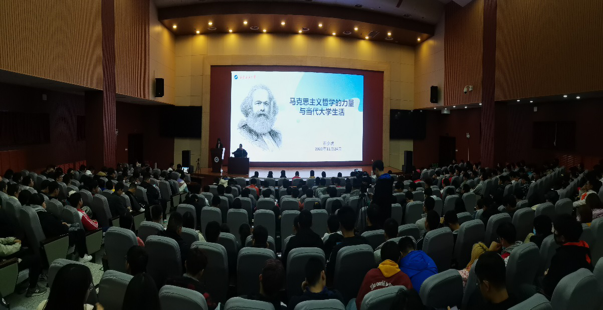 本次講座主要有兩部分,即馬克思主義哲學(xué)在現(xiàn)當(dāng)代社會(huì)中的價(jià)值及其與如何指導(dǎo)當(dāng)代大學(xué)生活。石少虎老師首先拋出兩個(gè)問題,即“何為哲學(xué)”和“哲學(xué)又為何”,又以幽默風(fēng)趣的語(yǔ)言講述了季羨林先生的故事和“三人行必有我?guī)煛钡睦?,給出自己的解答——哲學(xué)是萬(wàn)物的本源,是智慧,是樂趣。通過(guò)問題和事例引發(fā)大家的思考,進(jìn)而引入本次講座的第一個(gè)主題——馬克思主義哲學(xué),石老師向同學(xué)們介紹了三個(gè)方面的內(nèi)容:馬克思主義當(dāng)代價(jià)值的理論挑戰(zhàn)、馬克思主義的理論闡釋、堅(jiān)定馬克思主義的理論自信,通過(guò)對(duì)上述論點(diǎn)深入淺出地精彩講解,使得同學(xué)們對(duì)馬克思主義哲學(xué)當(dāng)代價(jià)值的認(rèn)識(shí)更加明晰。隨后,石老師引入“馬克思主義哲學(xué)與大學(xué)生活”這一核心觀點(diǎn),他認(rèn)為,大學(xué)的生活與責(zé)任即是要學(xué)會(huì)辯證地看待問題、要敢于人先大膽創(chuàng)新。在介紹完馬克思主義哲學(xué)與大學(xué)的聯(lián)系之后,石老師用同學(xué)們樂于接受的語(yǔ)言方式講述了歷史上的名人事例,并對(duì)比古今中外思想成果,探尋了人類思想發(fā)展的脈絡(luò),更新了同學(xué)們對(duì)馬克思主義思想的高度,更是讓同學(xué)們對(duì)于馬克思主義在未來(lái)中國(guó)發(fā)展產(chǎn)生了更美好的憧憬與強(qiáng)烈的自信。