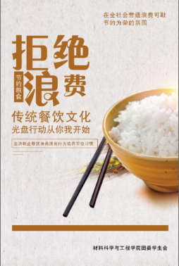 圍繞“拒絕餐飲浪費”主題,材料科學(xué)與工程學(xué)院在微信公眾平臺、QQ群等進行宣傳,并發(fā)出倡議。在全體學(xué)生中營造厲行節(jié)約、反對浪費、崇尚節(jié)儉的良好氛圍,樹立“一粥一飯當(dāng)思來之不易,半絲半縷恒念物力維艱”的勤儉節(jié)約意識。