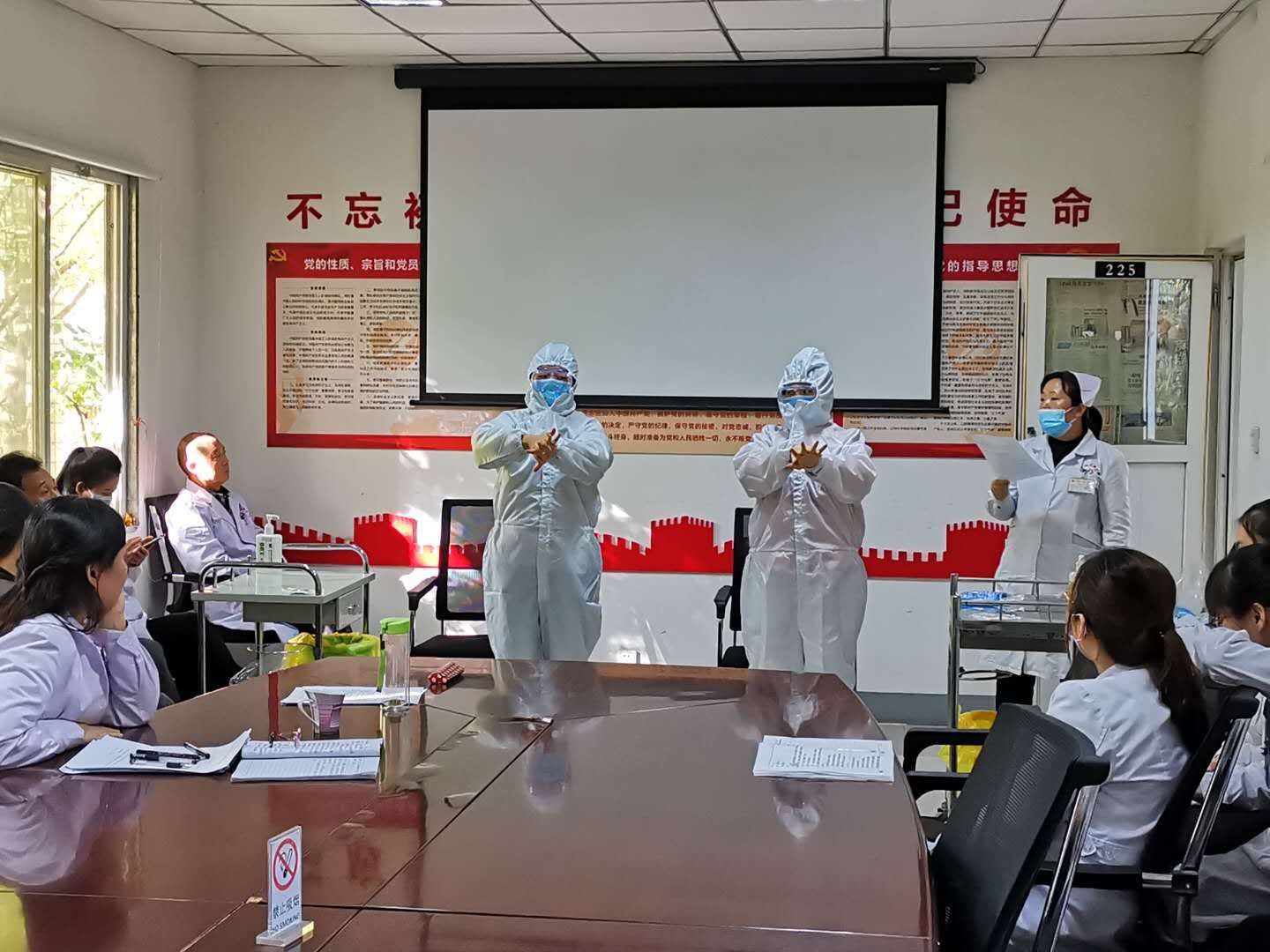 三、進(jìn)行穿脫防護(hù)服演示及練習(xí),由茹萍護(hù)士長(zhǎng)負(fù)責(zé)講解,兩名工作人員示范手衛(wèi)生和穿脫防護(hù)服的方法演示并手把手指導(dǎo)大家再次進(jìn)行練習(xí),通過練習(xí)和現(xiàn)場(chǎng)考核,大家能夠熟練掌握穿脫隔離衣的技術(shù),培訓(xùn)得到較好的效果。