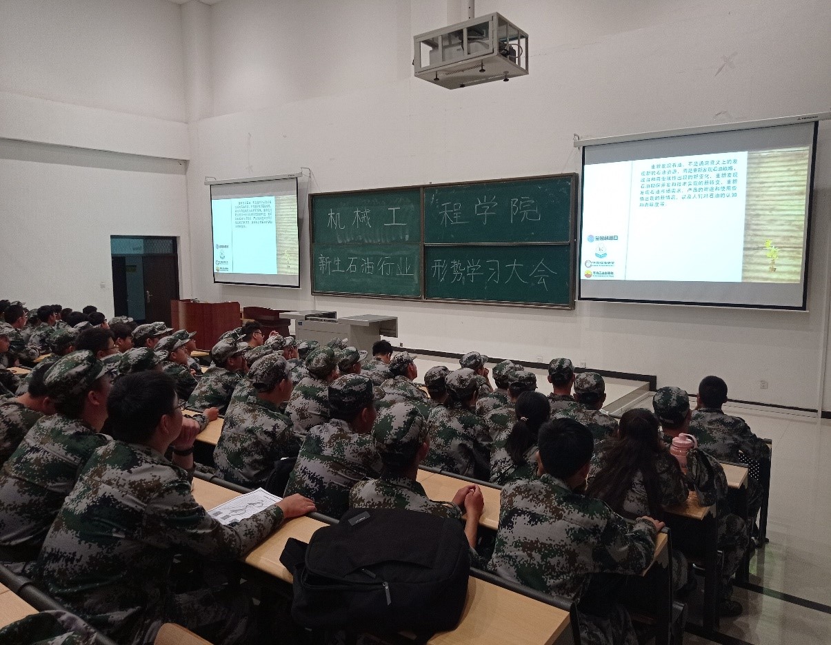 為貫徹落實學(xué)校三全育人精神,促使新生更好地了解石油行業(yè)發(fā)展,學(xué)習(xí)弘揚石油精神、鐵人精神,踐行學(xué)?!八膶嵰恍隆比瞬排囵B(yǎng)理念,盡快融入校園文化氛圍。按照學(xué)校軍訓(xùn)科目的統(tǒng)一安排,925日晚,機械工程學(xué)院2020級新生石油行業(yè)形勢教育大會在鄠邑校區(qū)機械材料樓115室舉行。400多名新生參加本次大會,會議由2020級輔導(dǎo)員馬舒宇主持。