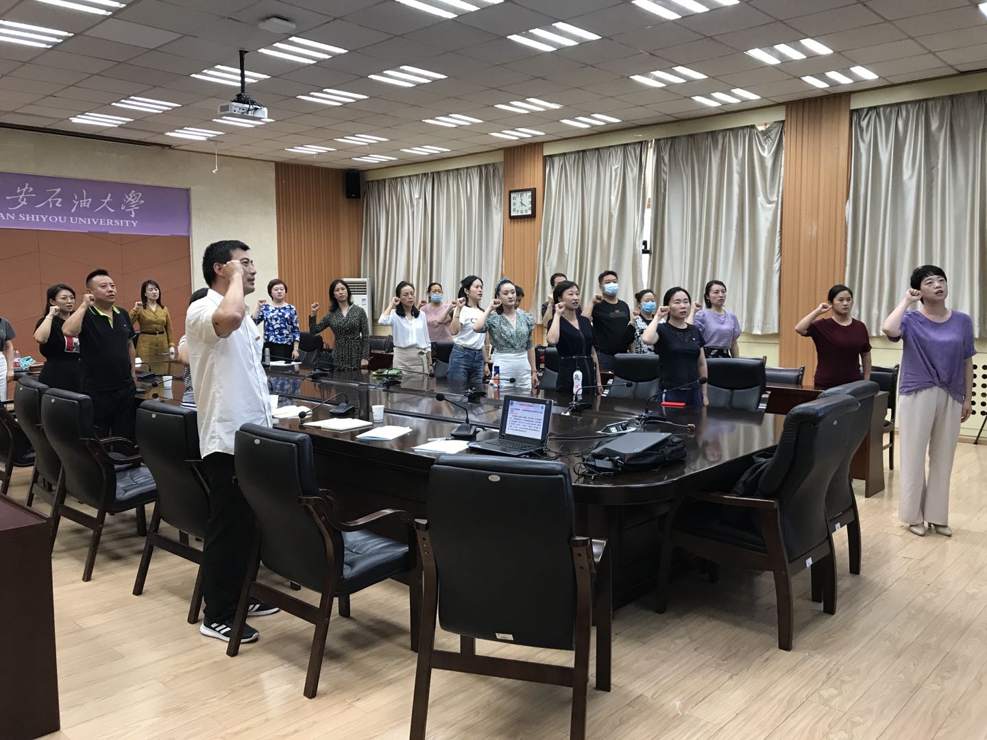 最后,在領(lǐng)誓人2020年校級師德先進(jìn)個人駱珞老師的帶領(lǐng)下,教師全體肅立,右手舉拳,面對國旗莊嚴(yán)宣誓“我志愿成為一名光榮的人民教師,忠誠黨的教育事業(yè),貫徹黨的教育方針,履行教師的神圣職責(zé)......”。